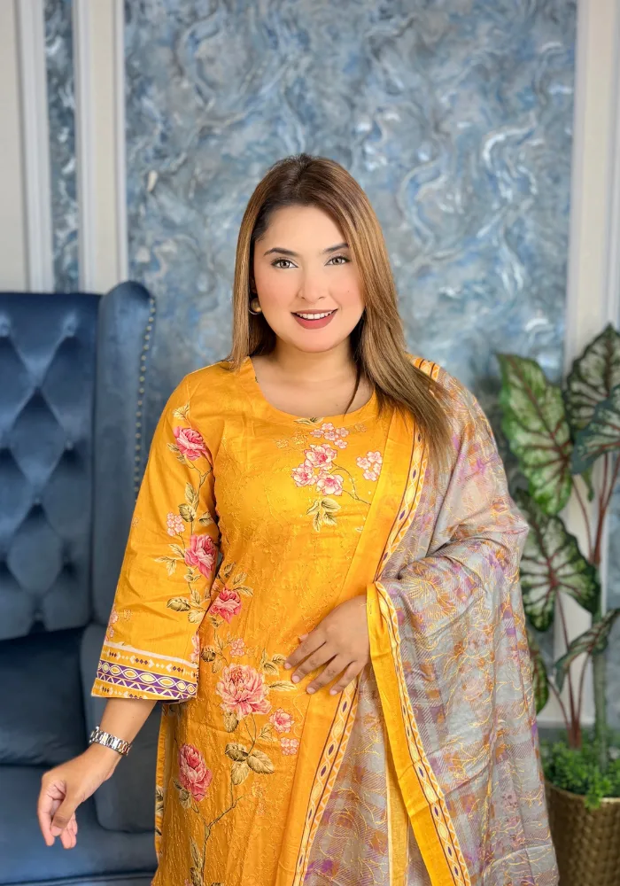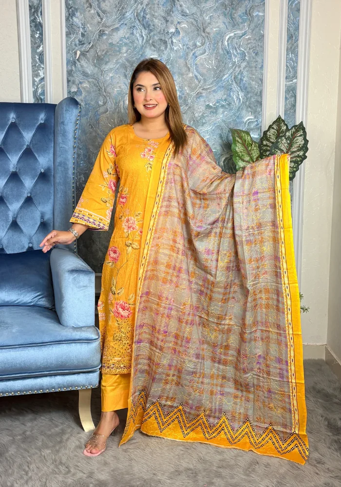 সম্পূর্ণ প্রিমিয়াম কটন এম্বুডারি ও চিকেন কারি কাজের থ্রি-পিস ড্রেস ❤❤ “Super Duper Collection”